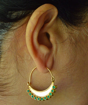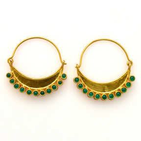 These earrings made in green onyx and zircons studded in sterling silver and plated in 18k gold can be worn in two ways. with the green onyx stones showing on the outside or the zircons visible on the outside.